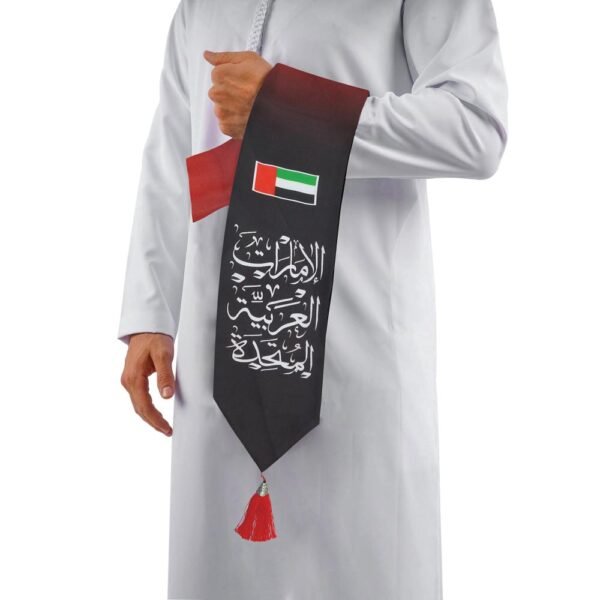 introduces a significant element of cultural richness. This could encompass various forms of expression, such as old proverbs, national slogans, or poetic verses, which serve to enhance the aesthetic appeal and foster a profound sense of connection to the cultural history of the United Arab Emirates. Fabric Selection: The selection of fabric would strike a harmonious balance between durability and elegance, rendering it appropriate for both regular use and formal events. The focus of attention in this discussion is the intricate and decorative element known as tassel detail. The incorporation of red and green tassels, which mirror the hues found on the flag of the United Arab Emirates, serves toaugment the aesthetic charm and cultural importance of the scarf. The tassels possess the potential to be intricately